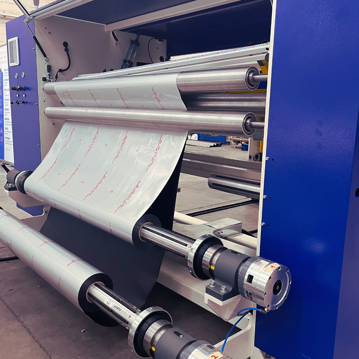 The structure of laminator is available in two configurations to accommodate different production layouts and material flow through the lamination head. The unwinding structure for heavy rolls also varies between: floor-mounted unwinders or mezzanine-mounted unwinders.